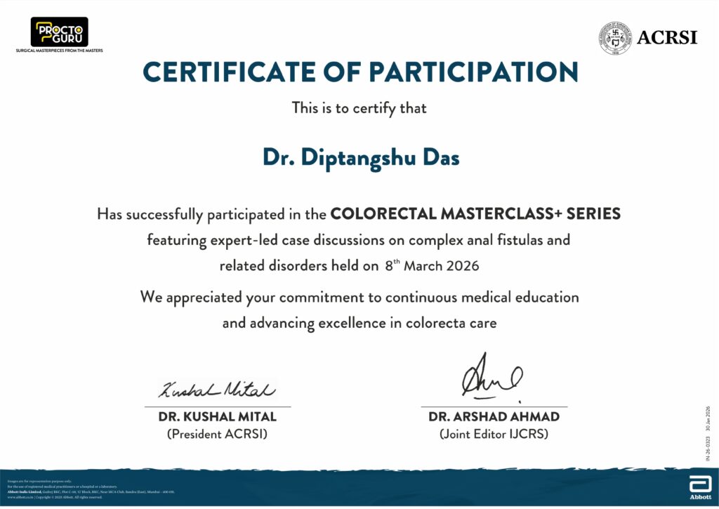 Grateful to have successfully participated in the Colorectal Masterclass+ Series conducted by ProctoGuru and ACRSI, focusing on expert-led discussions on complex anal fistulas and related colorectal disorders. Continuous learning and academic engagement remain essential to improving surgical skills and delivering better, safer care to patients.